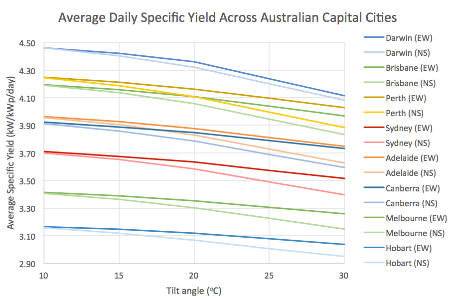 It was interesting to observe that in most places, north-south arrays have better average specific yield than east-west arrays at higher pitches. For example, even a 20° pitch north-south array in Hobart has a higher specific yield than a 30° pitch east-west array at the same location.