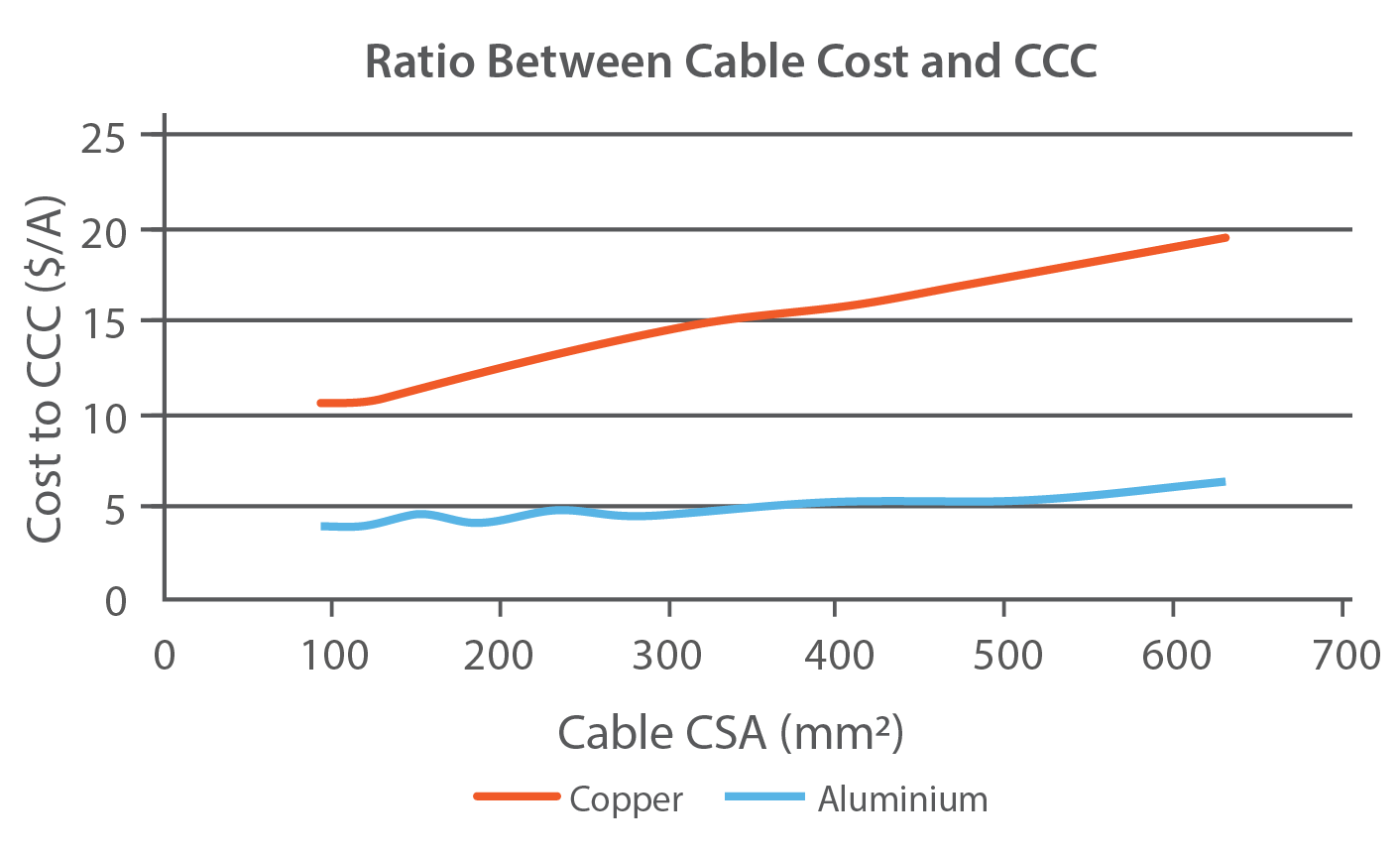 It is also interesting to note that the ratio between cable cost and CCC increases significantly with cable size for copper, whereas aluminium stays relatively stable (Figure 1). This suggests aluminium is especially well suited to projects with higher CCC requirements. At lower CCC, the additional costs for maintenance, bi-metallic lugs and cable support for aluminium may give copper the advantage.