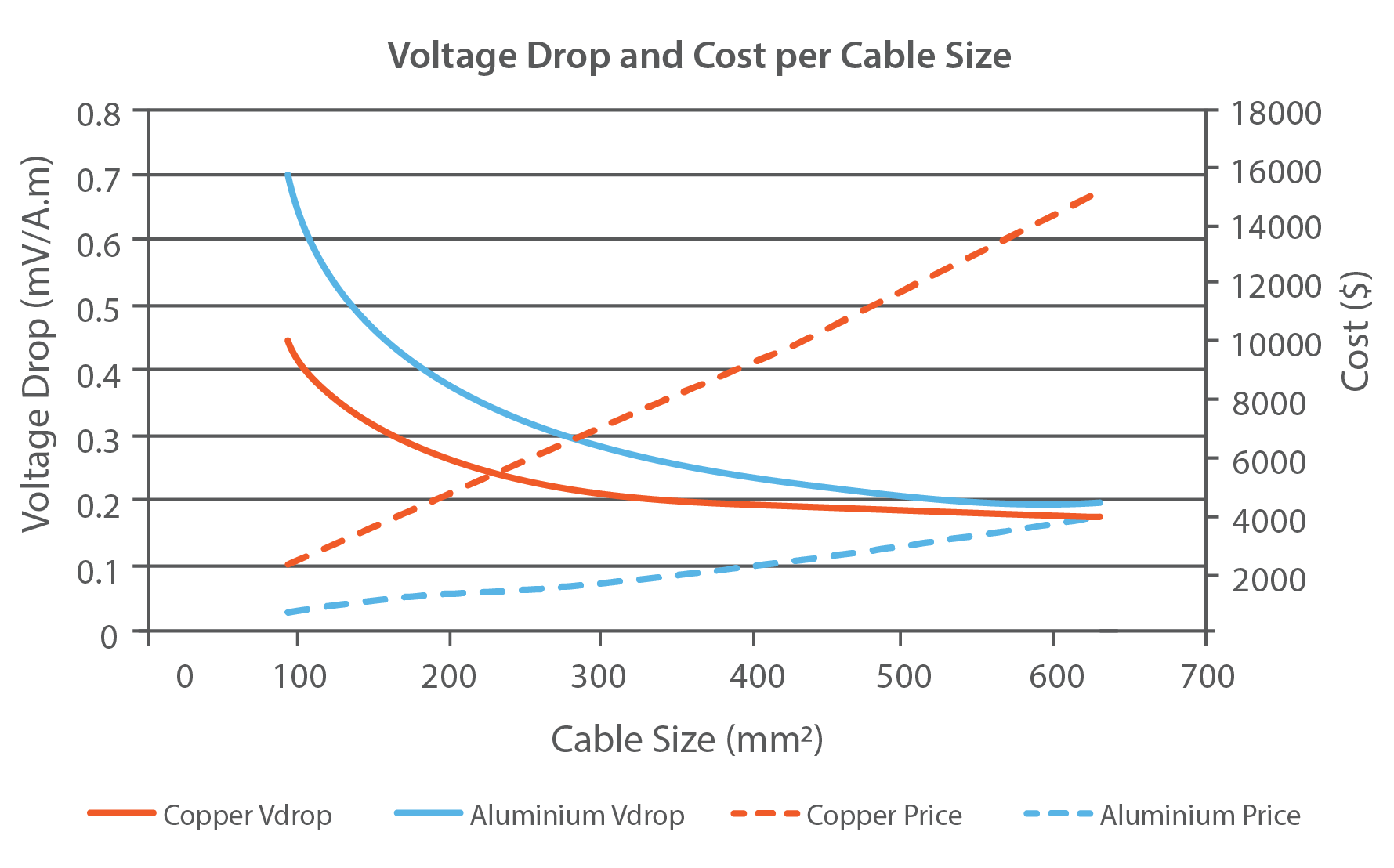 With increasing cable size, the difference in voltage drop between copper and aluminium decreases while the cost of copper increases significantly (Figure 2). Much like the CCC, this indicates that aluminium has a strong cost advantage when small voltage drop is required.