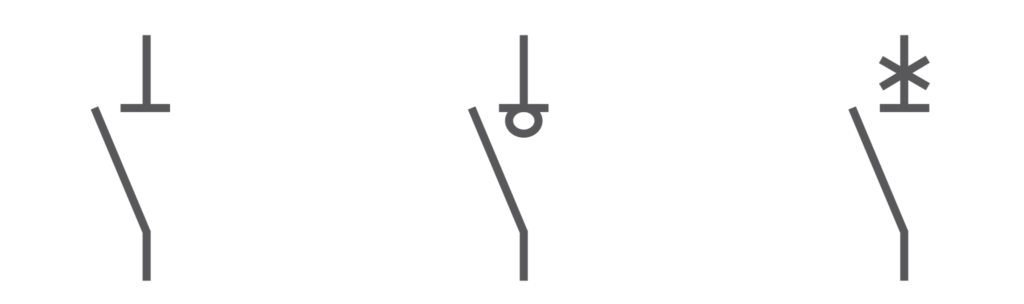 Figure 1 – Switch symbols. From left to right: disconnector, switch disconnector, and circuit breaker with isolation function