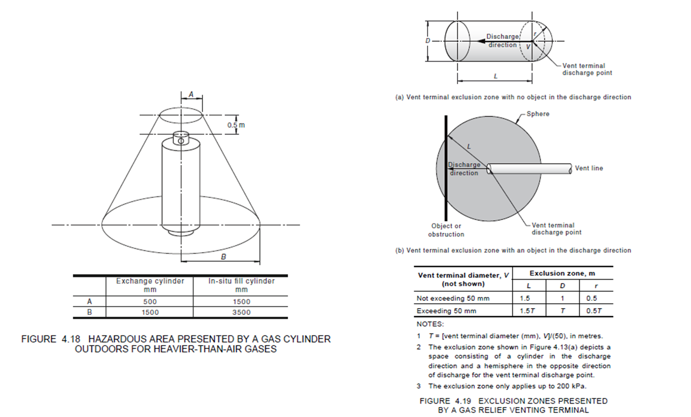 The following excerpts from AS/NZS 3000:2018 help illustrate the hazardous areas and exclusion zones for gas cylinders in proximity to ignition sources.