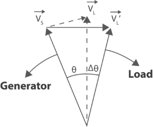 Figure 4: Change in the displacement angle during loss of mains event Dotted line shows vector operation during normal operation, solid line shows vector operation during loss of mains, ∆θ is measured to evaluate whether loss of mains has occurred.