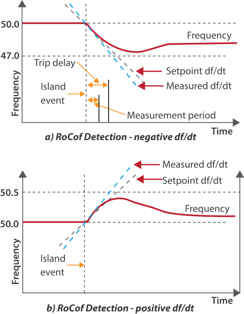 In electrical engineering, rate of change of frequency (ROCOF) is based on the principle of imbalance caused by input mechanical power and load. As this imbalance occurs after the disconnection from main grid, the frequency changes dynamically, even in grid-connected PV systems. This change in frequency is expressed as tangent in time (Hz/s). If the absolute value of the tangent exceeds the pre-determined pick up value, a trip signal to the relay is initiated.
