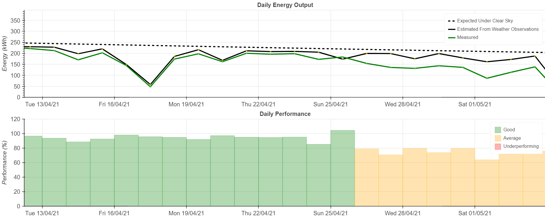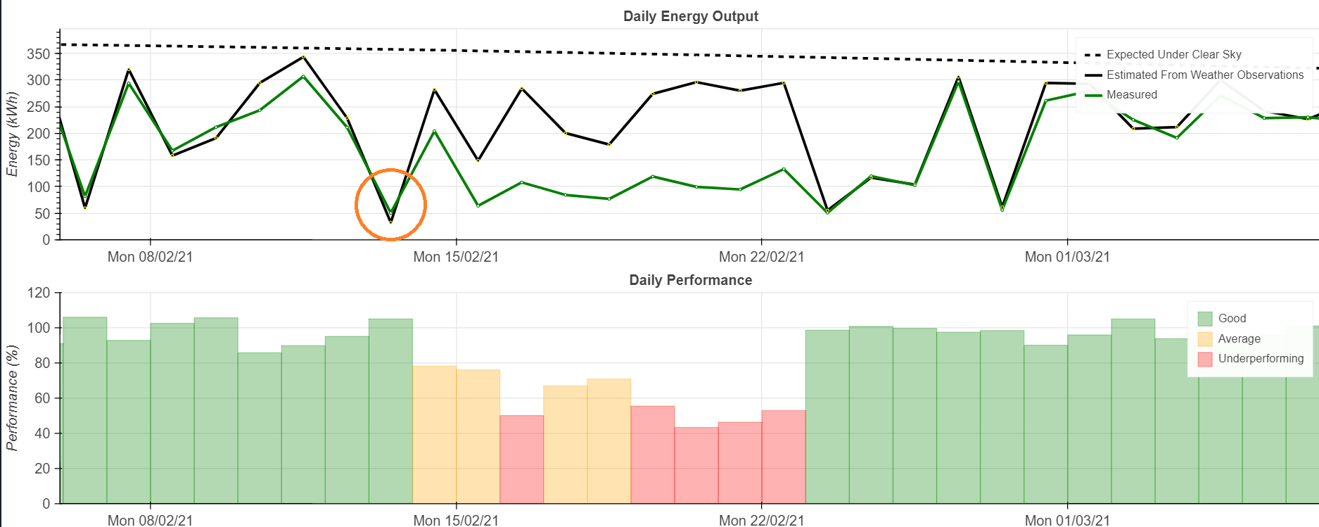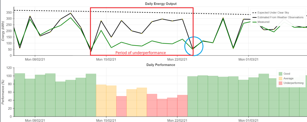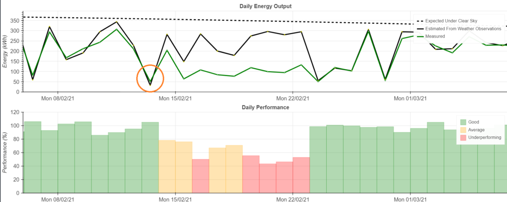 Figure 1 shows the daily energy output graph for the system in question. We can see the drop in performance on the 14th of February, indicated by the orange circle. The output of the system (green line on the top chart) is not following the expected performance from actual weather conditions (black line on top chart) for the period of 14th of February to 23rd of February.