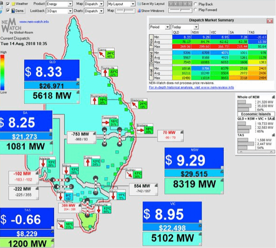 As was reported by AFR, Bloomberg and others last year the answer is, yes, but not always and not at wholesale. See below the screen capture from NEMWATCH showing very low spot pricing in some states and negative spot pricing in TAS. This low pricing could be used to charge batteries, pump water for storage or produce hydrogen. The result of this may ultimately be a flattening of energy prices, better load/generation balance and the ability for Australia to access other markets through the sale of Hydrogen.