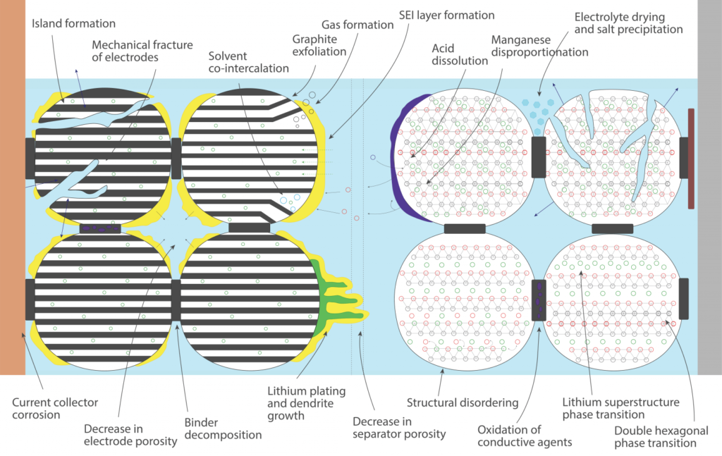 There are also a number of other lithium ion degradation methods caused by thermal stress, mechanical stress, rate or number of intercalations, charge levels, etc. The degradation types are shown in the figure below.