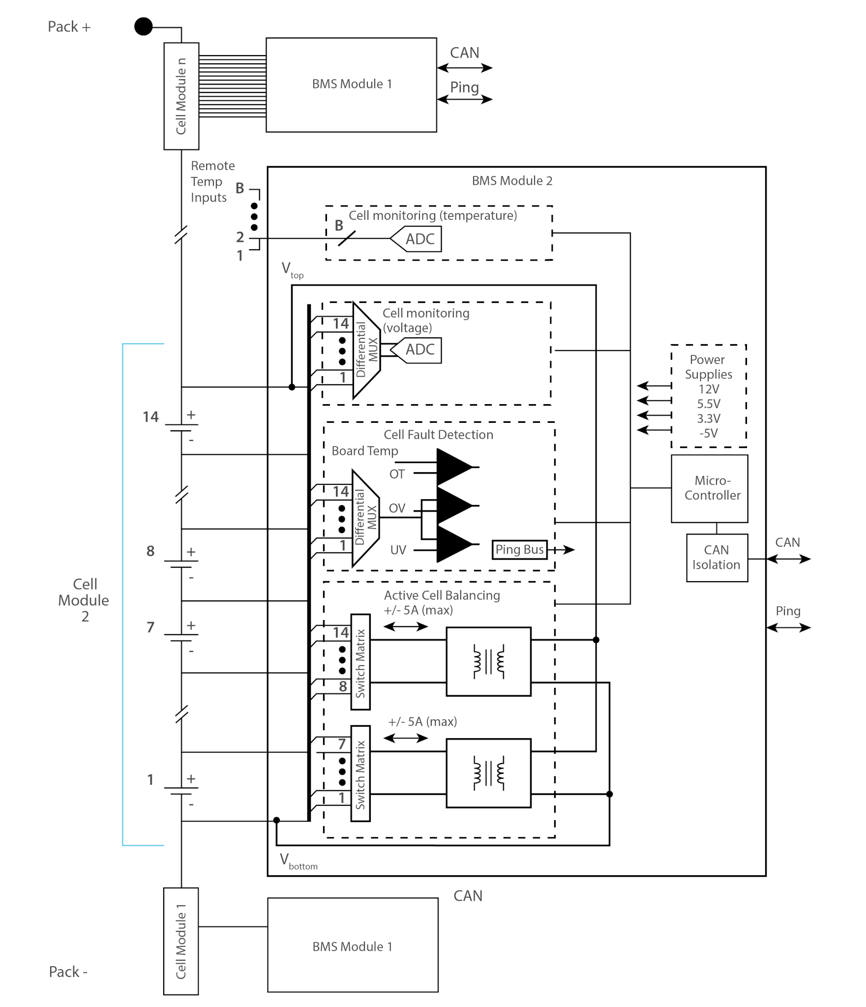 A BMS should, at a minimum monitor the voltage and temperature of each cell. The BMS will then use either active or passive charge methodology to charge, discharge or isolate each cell as appropriate. An active BMS uses integrated circuits and MOSFETS (metal-oxide-semiconductor field effect transistors) to shunt current across fully charged cells. A passive BMS uses dump resistors to dissipate energy from fully charged cells. The figure below is a simple schematic of an active BMS topology from Texas Instruments.