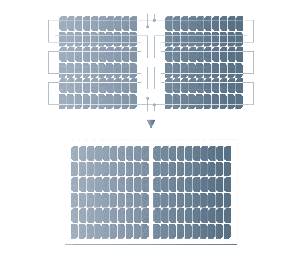 Half cut cell modules are made of cells that have been cut in half, resulting in a total of 120 or 144 cells in a single module – doubling the total count in comparison to a traditional solar module. Each half-cut cell produces the same voltage as a standard cell but only half the current, thus they are arranged in parallel strings (Figure 3) to mimic the voltage and current ratings of a conventional module. There are many benefits to this type of cell, many of which use PERC technology. The most prominent benefit is the reduction in current per individual cell, lowering resistive losses, which results in a gain in power per square metre.