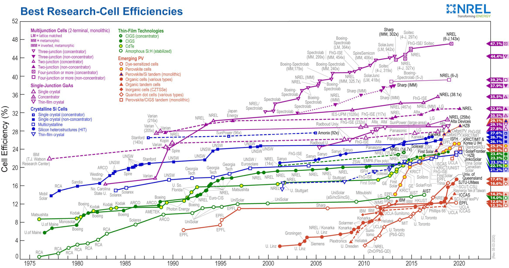 Figure 1: Efficiency improvements in research-grade solar cells since 1976
