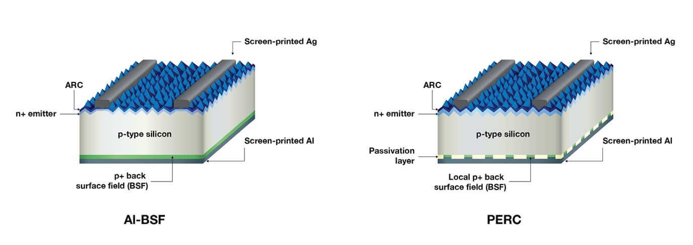 Passivated Emitter and Rear Cell (PERC) is a high efficiency solar cell architecture that differs from other conventional types of monocrystalline solar cells, such as aluminium back surface field (Al-BSF), as seen in Figure 2. In the Al-BSF structure, the metal on the rear of the cell is in direct contact with the silicon substrate. This full area metal/silicon interface causes a lot of losses, which limits the potential efficiency for this design.