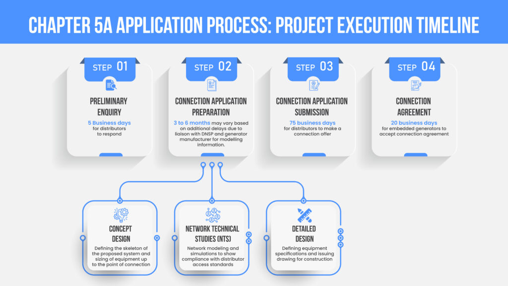 Chapter 5A applications skip the Detailed Enquiry stage. As per AEMC timelines, an applicant may expect to receive the connection agreement within 100 business days of submitting the initial connection enquiry under Chapter 5A. What it does not incorporate is the time required by the applicant to undertake a significant amount of work to prepare the connection application which involves detailed network modeling and studies completed in AEMO approved power system analysis software, design, and time allowed for distributors to respond to each stage of this process. A more realistic, but still approximate timeline is explained below: