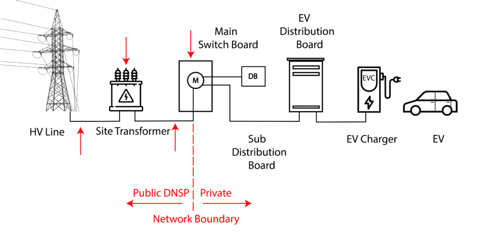 Figure 1. Description of a typical network boundary illustrates the elements allocated to the public DNSP (left side) and the private building (right side), as well as the critical points in the electrical infrastructure that determine the peak capacity of the specific connection to the grid.