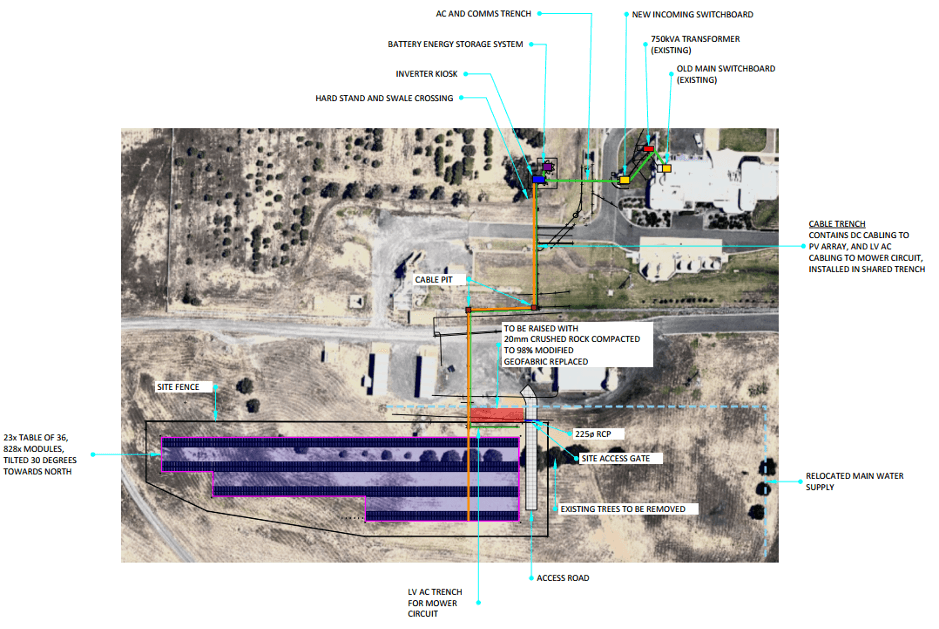 The presence of existing underground services presented a challenge to trench design and asset location. With only one available location for the inverters and battery system, a 200m trench was designed and cables derated to account for soil conditions and numerous nearby existing cables.