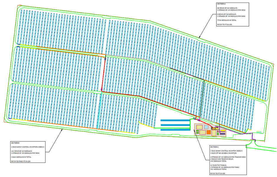 The design for this project was highly detailed, and involved a significant level of coordination with the end-client, installers, and other engineering subcontractors. In terms of system characteristics, the most interesting aspect of this project was the experimental testing sub-array, which contains one 60kW inverter worth of single-axis tracking, fixed frame, fixed bifacial, and fixed frameless modules. Each 60kWp section of this sub-array is connected to its own 60kVA string inverter, and the performance of each system will be compared for demonstration purposes. Finally, due to the significant number of cables installed in trenches for the site, thermal deratings needed to be thoroughly considered during design. In this case, a thermal analysis software was used to create detailed models of trench cross-sections, and confirm that selected cable sizes were adequate for required loads