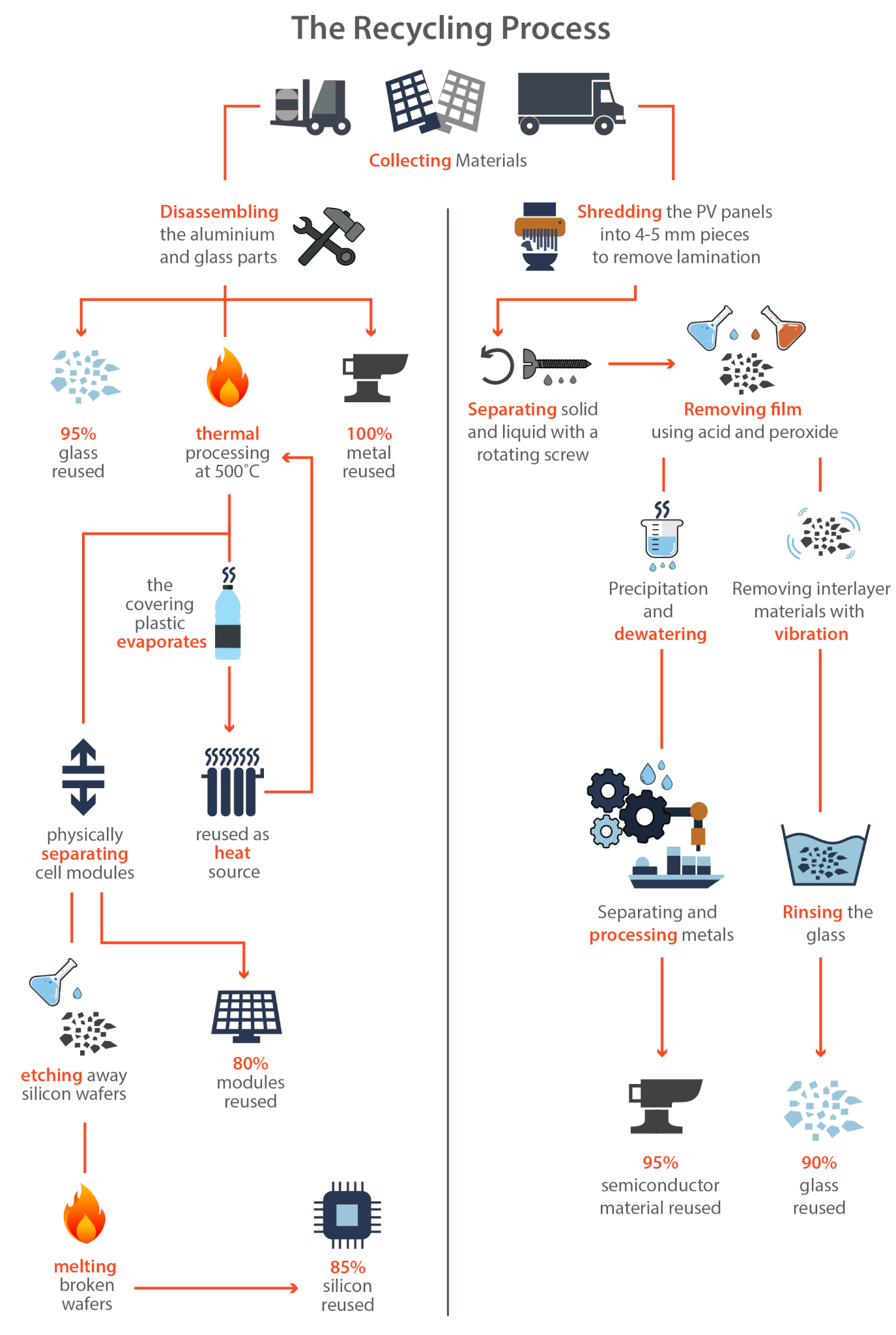 Recycling modules is a complex and currently quite expensive process and the industry is relatively immature in terms of commercialisation. While some of the components such as the glass and aluminium frame are relatively easy to reclaim, the costs involved with separating the encapsulant, solar cells and metals are much greater, in addition to the other costs involved such as the electrician uninstalling the modules and transporting them to a recycling plant. However, PV recycling technologies are still in the early stages. As is the case with all industrial technologies, the costs involved with recycling will only decrease as the process becomes simpler, more efficient and value chains are established for the recycled materials.