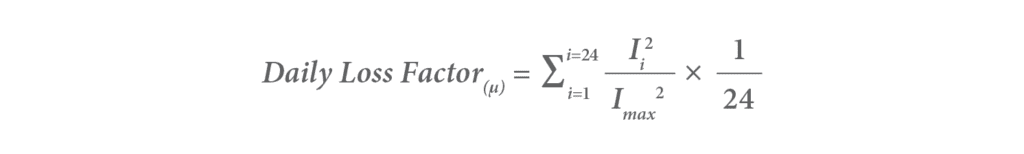The Daily Loss Factor (represented by the symbol μ) describes the ratio of the average current of a circuit (can be either consumed or produced) in an hourly interval to the maximum current within a given day, and can be defined with the following formula: