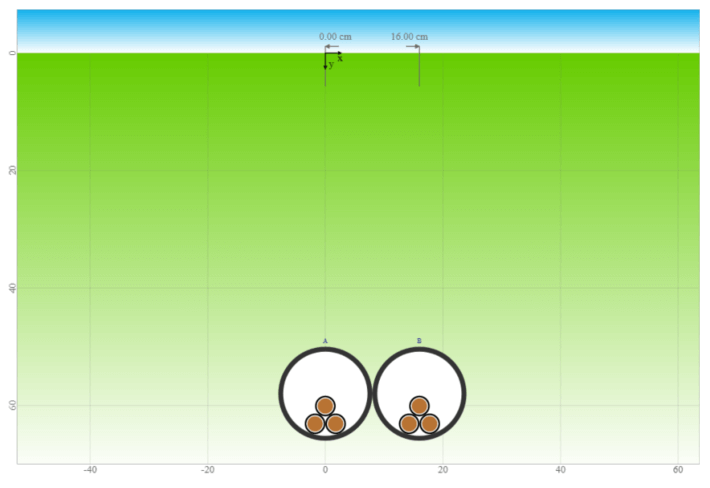 Based on a common test case below, we will use IEC 60287 calculations to assess the maximum temperature reached by underground trenches composed of various quantities of adjacent lightly-loaded circuits. The modelled circuit is:
