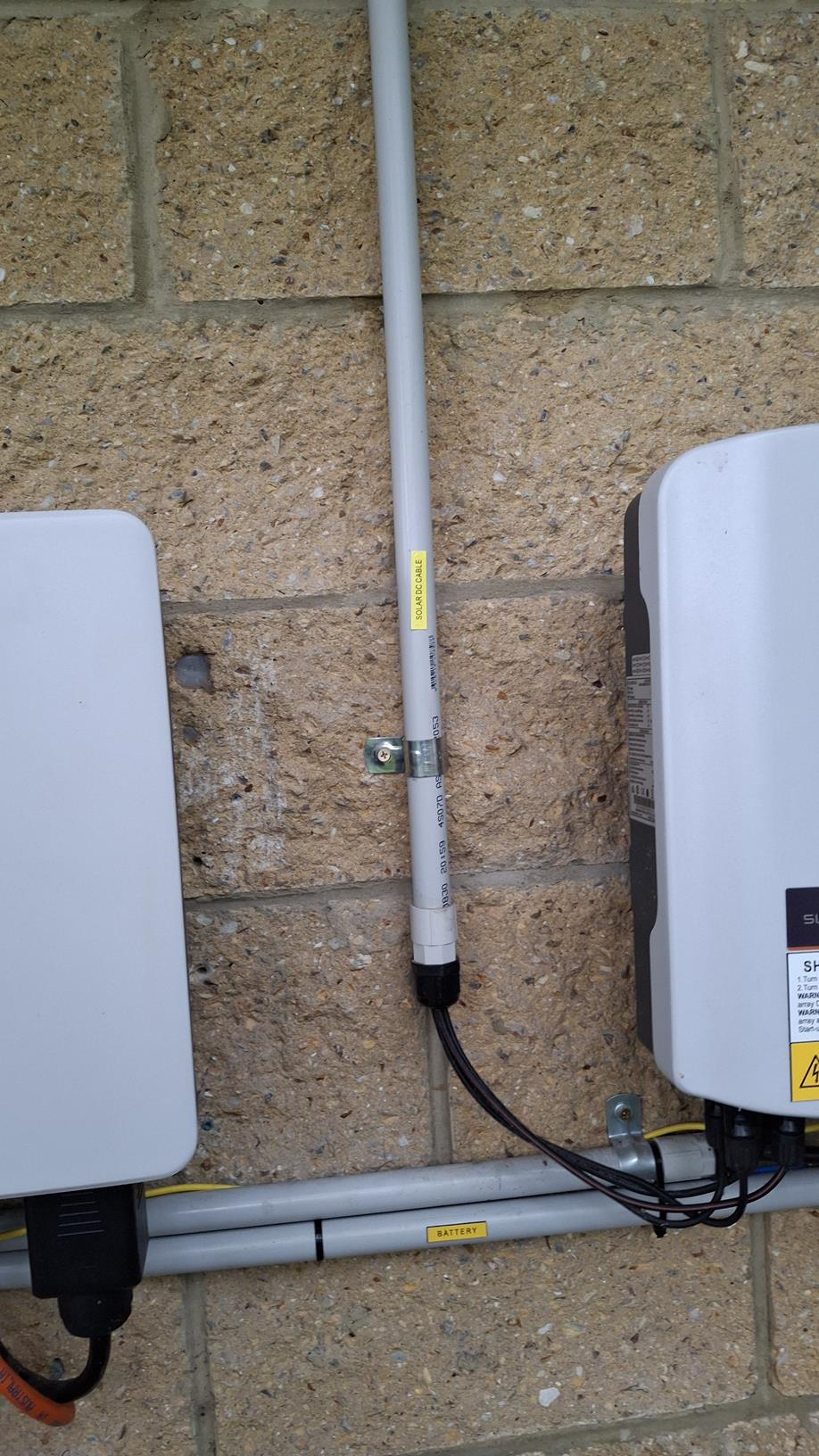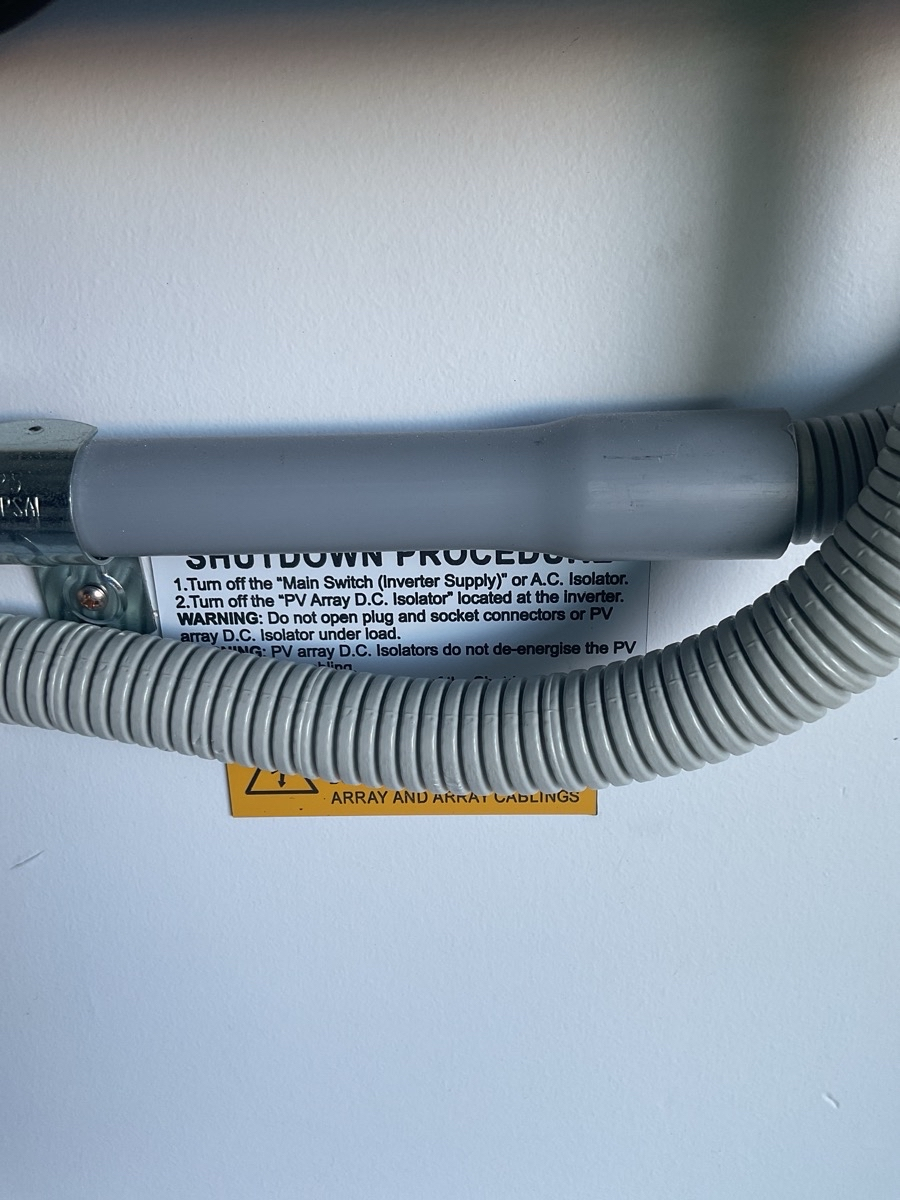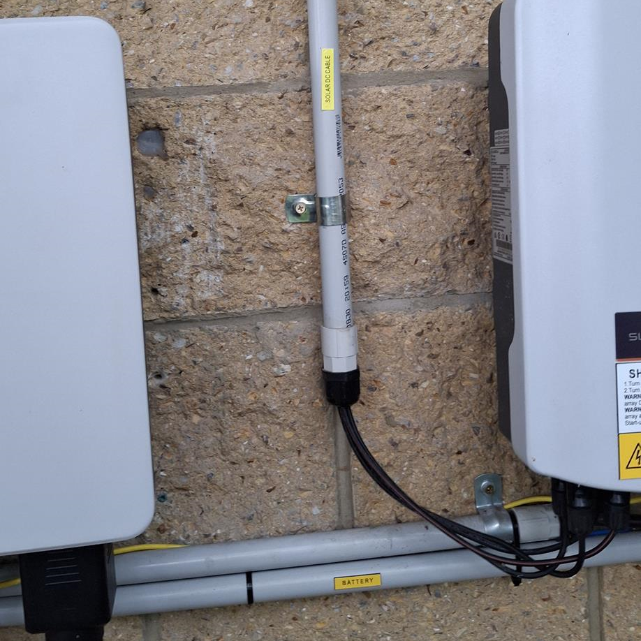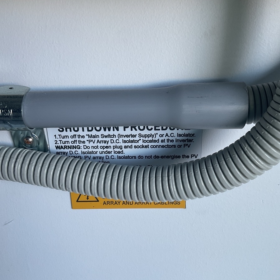 - All AC and DC conduit should be labelled to clearly identify what energy source it is attached to. For example, battery DC conduit should state Battery on it. The labels should be visible and reoccurring every 2m along the conduit or cable duct used. AS/NS 4777.1-2024 6.11.3.2