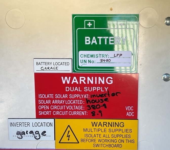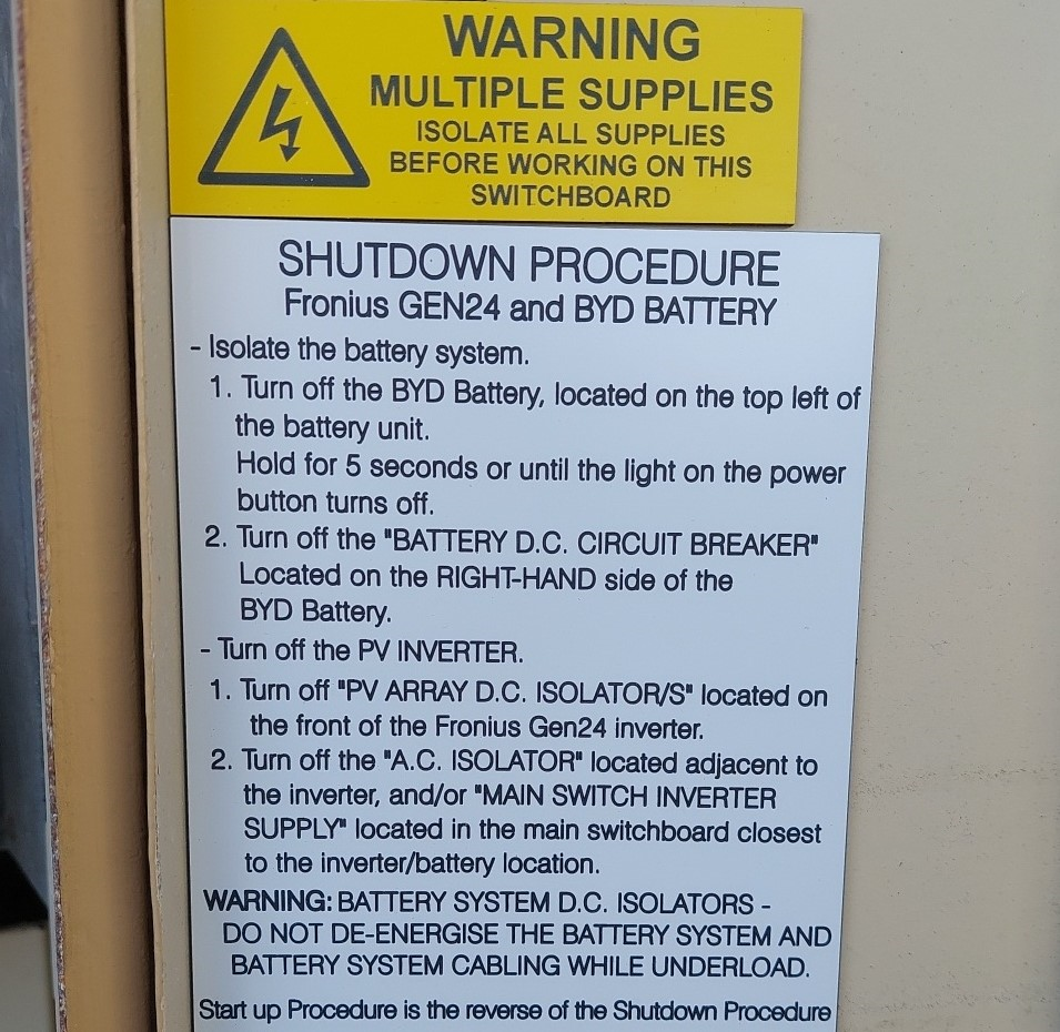 - Shutdown Procedure signs are expected to be visibly present at the switchboard or distribution board connected to the solar system. Please keep in mind that the switches mentioned in the Shutdown Procedure MUST match those installed on site. There are many occurrences where installers just slap on any shutdown procedure that mention switches that don’t actually exist in the system. Shutdown procedures should dictate the procedures for the PV Array, Inverter, and the Battery if they exist in the system. AS/NS 4777.1-2024 6.2