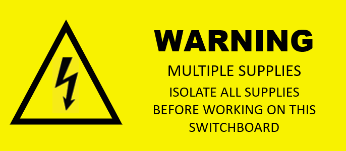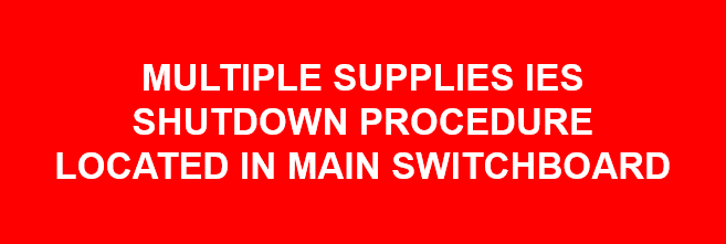 - On the main switch board or distribution board connected directly to the IES, please place the ‘WARNING MULTIPLE SUPPLIES ISOLATE ALL SUPPLIES BEFORE WORKING ON THIS SWITCHBOARD’ sign. AS/NS 4777.1-2024 6.3 (g)