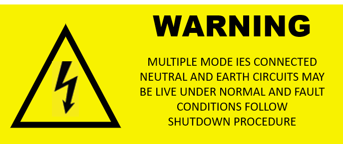 - All switchboards and distribution boards electrically connected to a multi-mode IES should have the Multiple Mode IES warning sign attached to it to let the person know that there is a specific shutdown procedure to safely shutdown and isolate the system. AS/NS 4777.1-2024 6.8