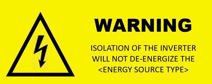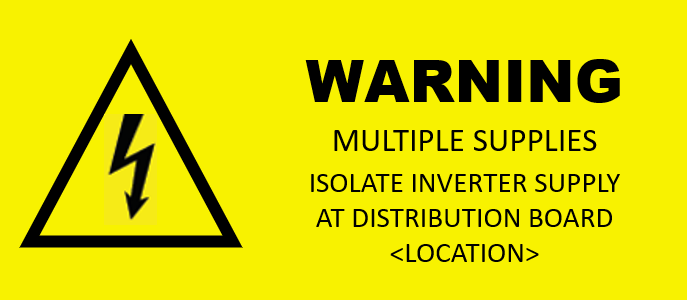 - When there are multiple energy sources connected to an inverter, a warning sign must be placed that indicates all supplies must be turned off to achieve complete isolation for the inverter. The sign should be placed on or near the inverter. AS/NS 4777.1-2024 6.11.1