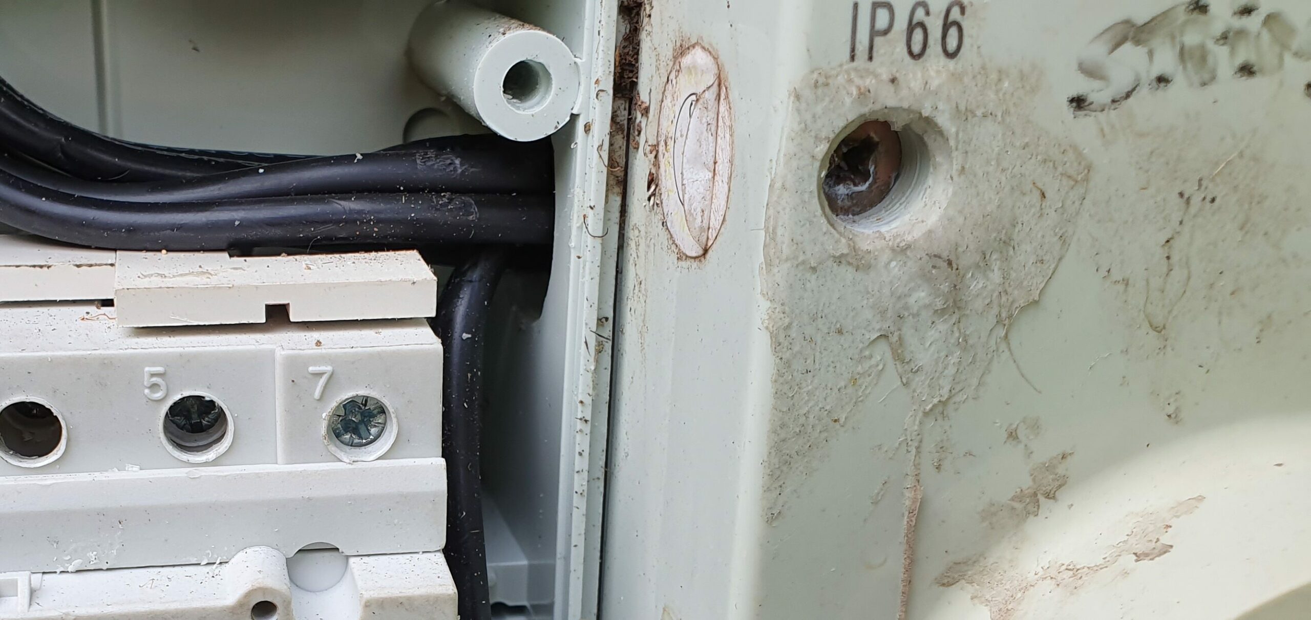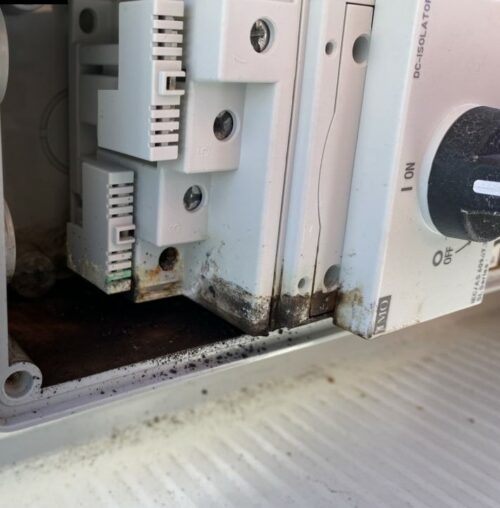 Without proper installation methods to maintain the ingress protection (IP) of the isolator enclosures, water can get in and accumulate inside the isolator enclosure, causing corrosion of the terminals and, in the case of inundated isolators, damage internal components of the isolator too. When the isolator carries current in this state, higher resistance at points where corrosions has occurred, causing a hot joint which can eventually lead to fire.