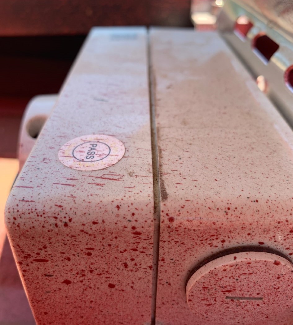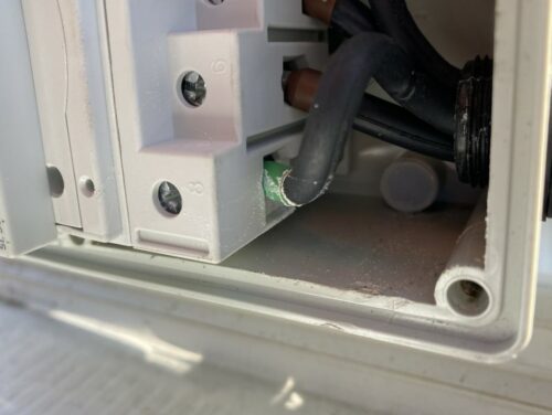 Figure 3 – Partial immersion of the isolator and corrosion evident with watermark and presence of green – copper conductor corroded, and brown – iron screw corroded